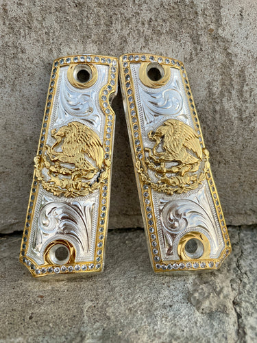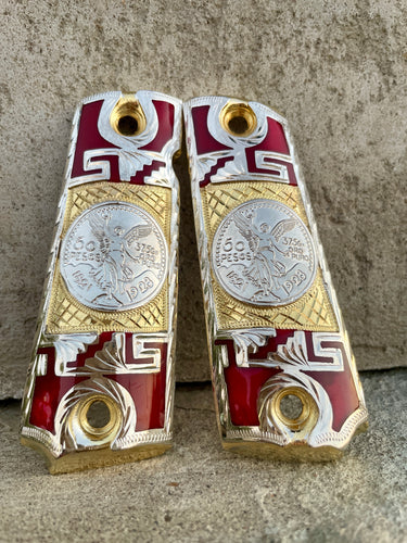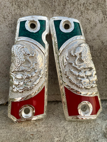 Cachas para 1911 igual a las de la foto quedan en todos los calibre y marcas de 1911 modelos de gobierno, Colt, Sig, Springfield, Ruger. Nuestras cachas son hechas y chapeadas a mano. Si necesita algo hecho con nombre o logo mande mensaje o llamar al 8303520670